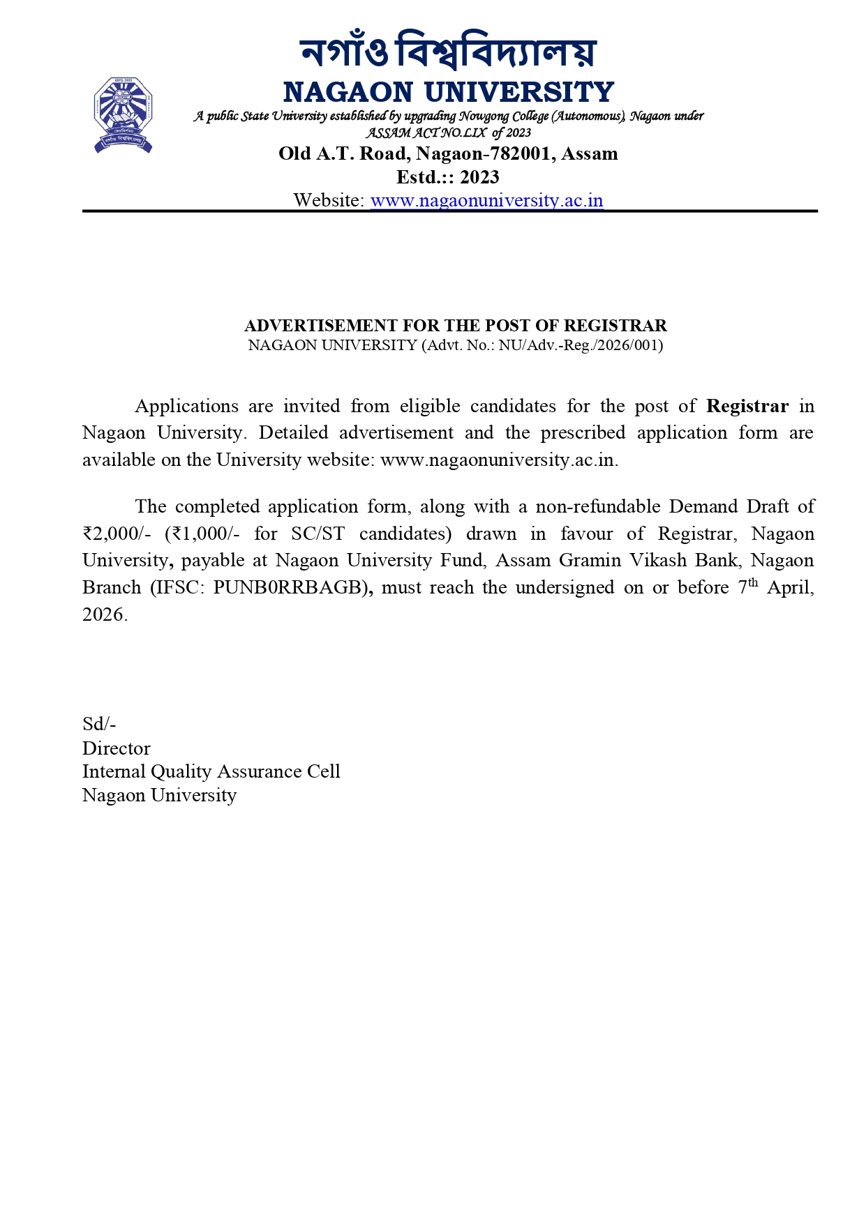 Nagaon University is a state university in Assam that evolved from the historic Nowgong College, established in 1944. The college received Autonomous Status in 2020, and through The Nagaon University Act, 2023, enacted by the Government of Assam, it was upgraded into a full-fledged university. Today, Nagaon University continues its long academic legacy with a strong commitment to quality education and research.